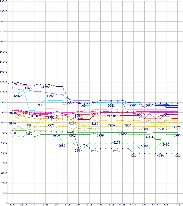 | CPU主要製品(最安値1万円未満)の最安値推移 | | | (2004年12月3日~2005年7月15日) |