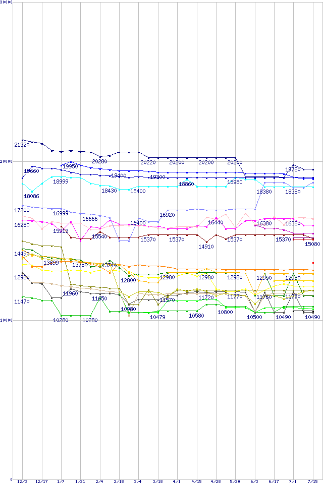 | CPU主要製品(最安値1万円~2万円未満)の最安値推移 | | | (2004年12月3日~2005年7月15日) |