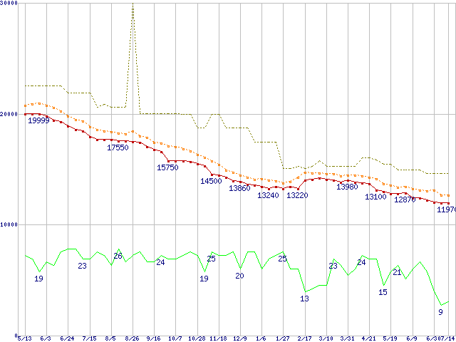 ※このグラフは過去のデータも税率5%相当に調整した税込み相当額のグラフです。 税率変更や、総額表示方式導入(2004年4月)の影響は除いています。 | | | ●凡例 | 最安値 (点線部は販売店未確認 または未調査) | 平均値 | 最高値 | ショップ数 |