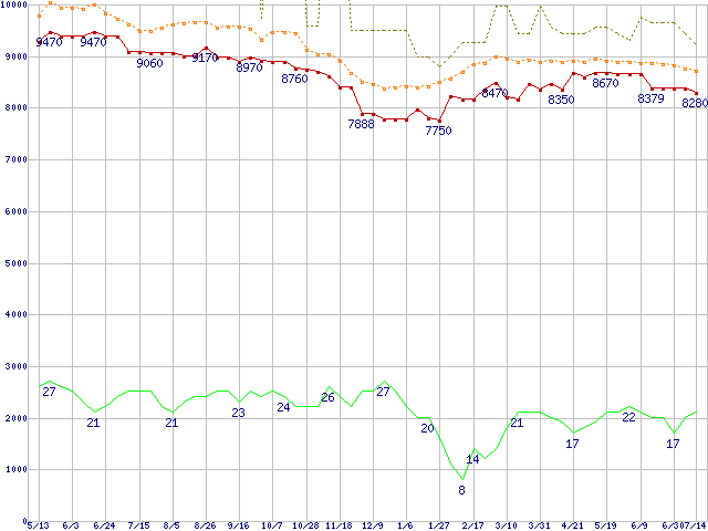 ※このグラフは過去のデータも税率5%相当に調整した税込み相当額のグラフです。 税率変更や、総額表示方式導入(2004年4月)の影響は除いています。 | | | ●凡例 | 最安値 (点線部は販売店未確認 または未調査) | 平均値 | 最高値 | ショップ数 |