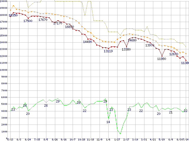 ※このグラフは過去のデータも税率5%相当に調整した税込み相当額のグラフです。 税率変更や、総額表示方式導入(2004年4月)の影響は除いています。 | | | ●凡例 | 最安値 (点線部は販売店未確認 または未調査) | 平均値 | 最高値 | ショップ数 |