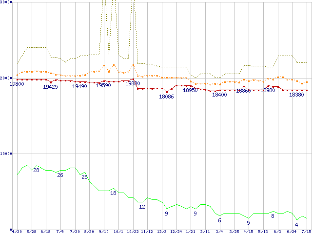 ※このグラフは過去のデータも税率5%相当に調整した税込み相当額のグラフです。 税率変更や、総額表示方式導入(2004年4月)の影響は除いています。 | | | ●凡例 | 最安値 (点線部は販売店未確認 または未調査) | 平均値 | 最高値 | ショップ数 |