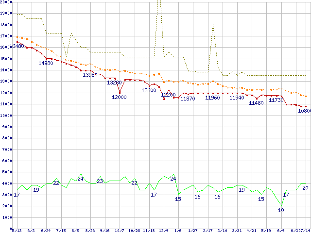 ※このグラフは過去のデータも税率5%相当に調整した税込み相当額のグラフです。 税率変更や、総額表示方式導入(2004年4月)の影響は除いています。 | | | ●凡例 | 最安値 (点線部は販売店未確認 または未調査) | 平均値 | 最高値 | ショップ数 |