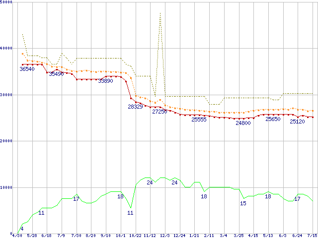 ※このグラフは過去のデータも税率5%相当に調整した税込み相当額のグラフです。 税率変更や、総額表示方式導入(2004年4月)の影響は除いています。 | | | ●凡例 | 最安値 (点線部は販売店未確認 または未調査) | 平均値 | 最高値 | ショップ数 |