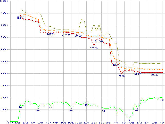 | Athlon 64 3800+(2.4GHz,L2 512KB)の価格推移 | | | (2004年4月30日~2005年7月15日) |
