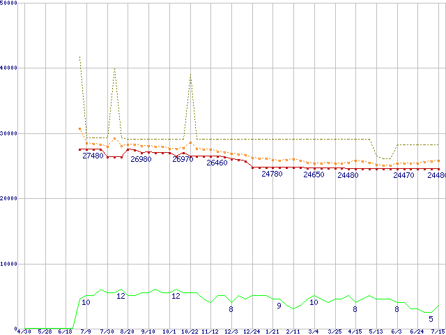 ※このグラフは過去のデータも税率5%相当に調整した税込み相当額のグラフです。 税率変更や、総額表示方式導入(2004年4月)の影響は除いています。 | | | ●凡例 | 最安値 (点線部は販売店未確認 または未調査) | 平均値 | 最高値 | ショップ数 |