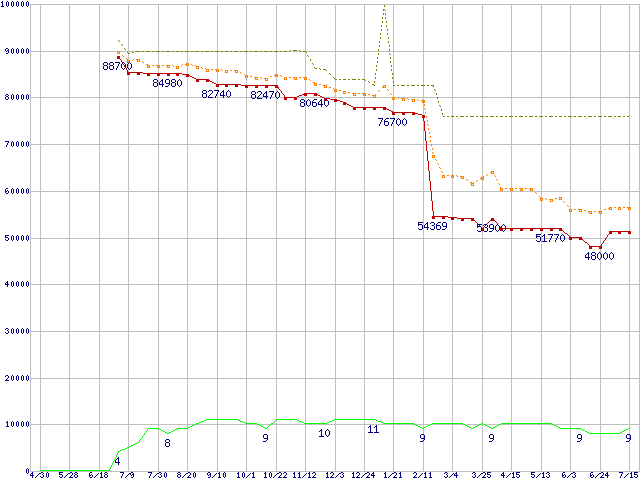 ※このグラフは過去のデータも税率5%相当に調整した税込み相当額のグラフです。 税率変更や、総額表示方式導入(2004年4月)の影響は除いています。 | | | ●凡例 | 最安値 (点線部は販売店未確認 または未調査) | 平均値 | 最高値 | ショップ数 |