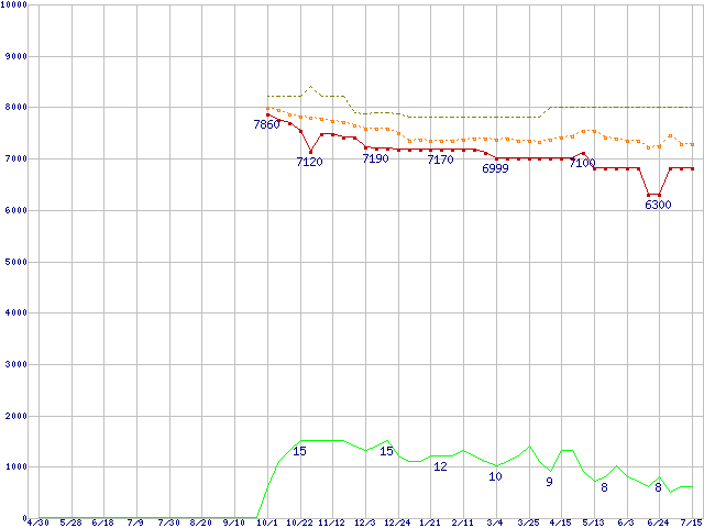 ※このグラフは過去のデータも税率5%相当に調整した税込み相当額のグラフです。 税率変更や、総額表示方式導入(2004年4月)の影響は除いています。 | | | ●凡例 | 最安値 (点線部は販売店未確認 または未調査) | 平均値 | 最高値 | ショップ数 |