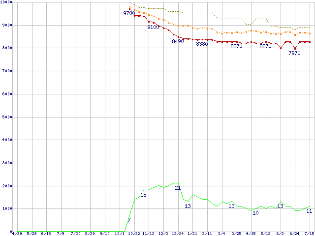 ※このグラフは過去のデータも税率5%相当に調整した税込み相当額のグラフです。 税率変更や、総額表示方式導入(2004年4月)の影響は除いています。 | | | ●凡例 | 最安値 (点線部は販売店未確認 または未調査) | 平均値 | 最高値 | ショップ数 |