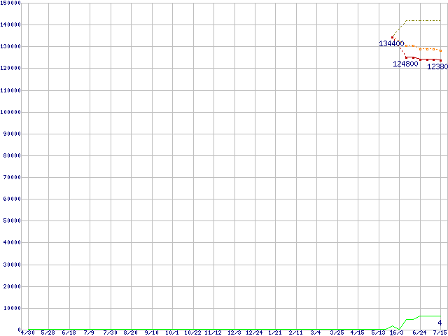 ※このグラフは過去のデータも税率5%相当に調整した税込み相当額のグラフです。 税率変更や、総額表示方式導入(2004年4月)の影響は除いています。 | | | ●凡例 | 最安値 (点線部は販売店未確認 または未調査) | 平均値 | 最高値 | ショップ数 |