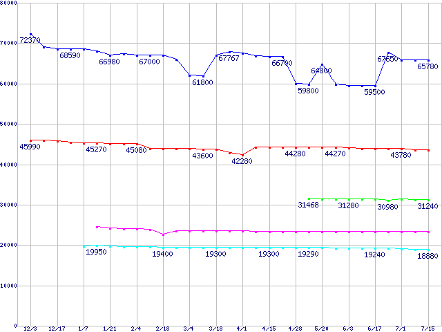 | LGA 775 (FC-LGA4 ,FSB 800MHz,L2 1MB,Hyper-Threading,Prescott,NX bit対応)の最安値推移 | | | (2004年12月3日~2005年7月15日) |