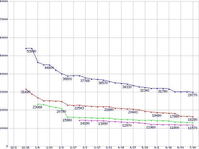 | Barracuda 7200.8 SATA (7200rpm,Serial ATA,NCQ,8MB,133GB/Platter)の最安値推移 | | | (2004年12月2日~2005年7月14日) |