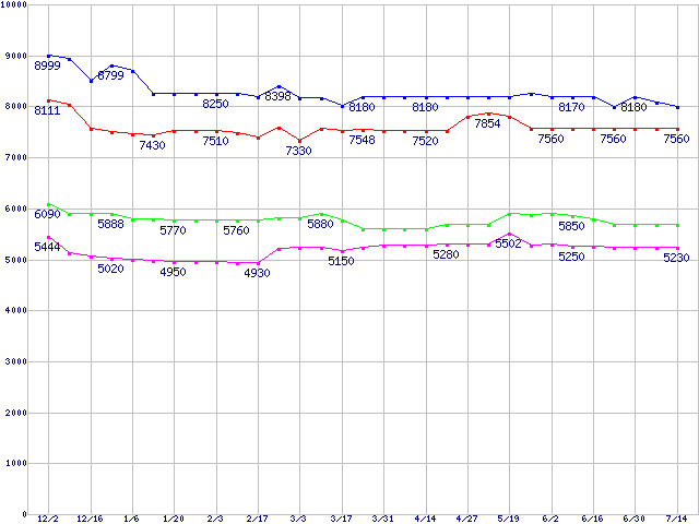 | Barracuda 7200.7 (7200rpm,Ultra ATA/100,2MB,80GB/Platter)の最安値推移 | | | (2004年12月2日~2005年7月14日) |