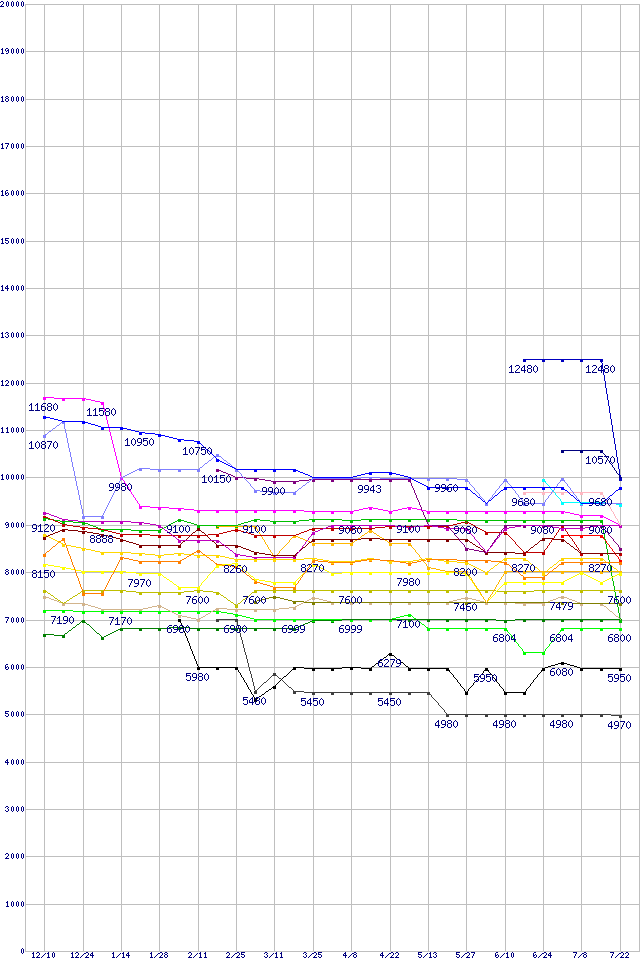 | CPU主要製品(最安値1万円未満)の最安値推移 | | | (2004年12月10日~2005年7月22日) |