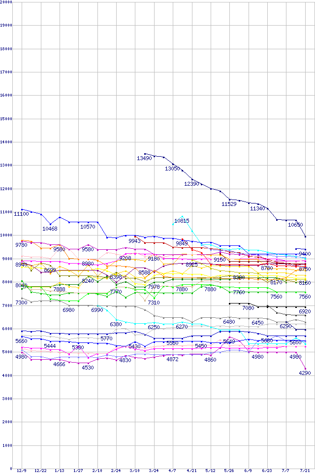 | HDD主要製品(最安値1万円未満)の最安値推移 | | | (2004年12月9日~2005年7月21日) |