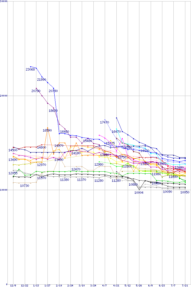 | HDD主要製品(最安値1万円~1万5千円未満)の最安値推移 | | | (2004年12月9日~2005年7月21日) |