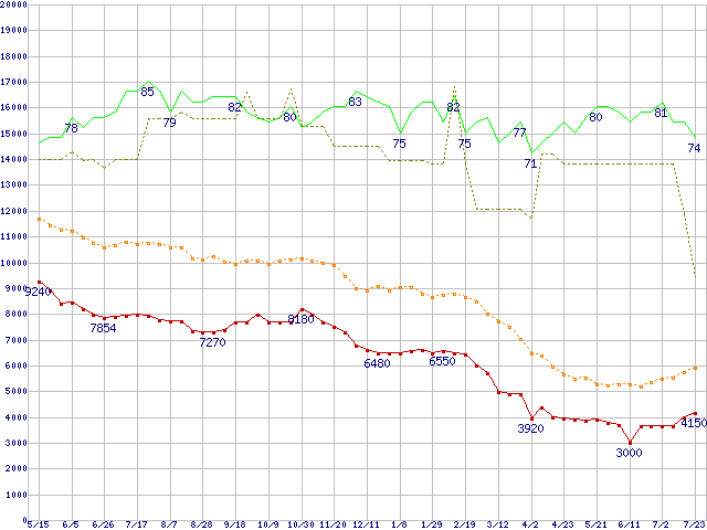 ※このグラフは過去のデータも税率5%相当に調整した税込み相当額のグラフです。 税率変更や、総額表示方式導入(2004年4月)の影響は除いています。 | | | ●凡例 | 最安値 (点線部は販売店未確認 または未調査) | 平均値 | 最高値 | ショップ数 |
