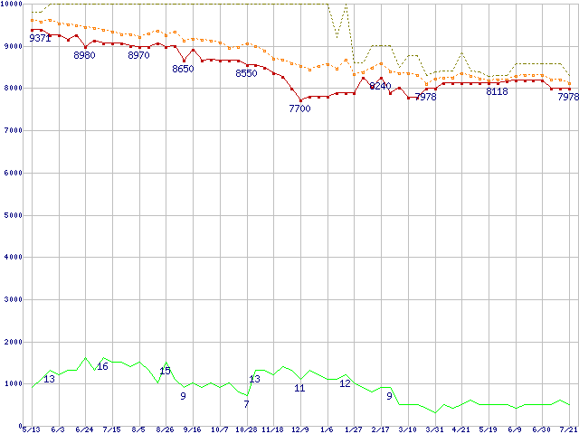 ※このグラフは過去のデータも税率5%相当に調整した税込み相当額のグラフです。 税率変更や、総額表示方式導入(2004年4月)の影響は除いています。 | | | ●凡例 | 最安値 (点線部は販売店未確認 または未調査) | 平均値 | 最高値 | ショップ数 |