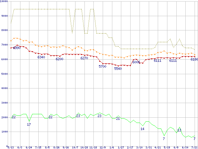 ※このグラフは過去のデータも税率5%相当に調整した税込み相当額のグラフです。 税率変更や、総額表示方式導入(2004年4月)の影響は除いています。 | | | ●凡例 | 最安値 (点線部は販売店未確認 または未調査) | 平均値 | 最高値 | ショップ数 |