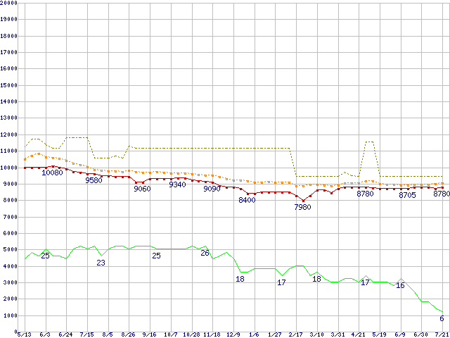 ※このグラフは過去のデータも税率5%相当に調整した税込み相当額のグラフです。 税率変更や、総額表示方式導入(2004年4月)の影響は除いています。 | | | ●凡例 | 最安値 (点線部は販売店未確認 または未調査) | 平均値 | 最高値 | ショップ数 |