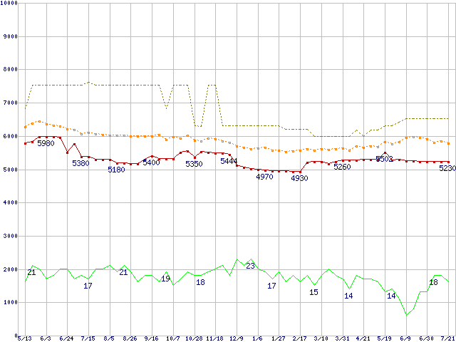 ※このグラフは過去のデータも税率5%相当に調整した税込み相当額のグラフです。 税率変更や、総額表示方式導入(2004年4月)の影響は除いています。 | | | ●凡例 | 最安値 (点線部は販売店未確認 または未調査) | 平均値 | 最高値 | ショップ数 |