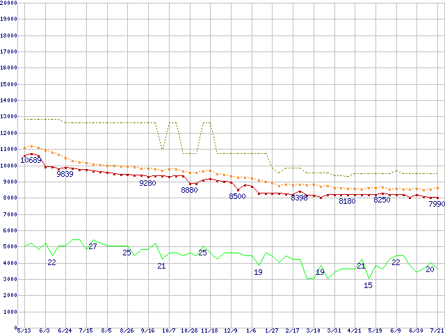 ※このグラフは過去のデータも税率5%相当に調整した税込み相当額のグラフです。 税率変更や、総額表示方式導入(2004年4月)の影響は除いています。 | | | ●凡例 | 最安値 (点線部は販売店未確認 または未調査) | 平均値 | 最高値 | ショップ数 |