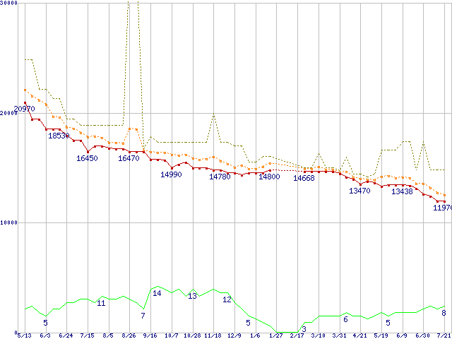 ※このグラフは過去のデータも税率5%相当に調整した税込み相当額のグラフです。 税率変更や、総額表示方式導入(2004年4月)の影響は除いています。 | | | ●凡例 | 最安値 (点線部は販売店未確認 または未調査) | 平均値 | 最高値 | ショップ数 |