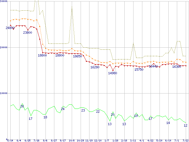 ※このグラフは過去のデータも税率5%相当に調整した税込み相当額のグラフです。 税率変更や、総額表示方式導入(2004年4月)の影響は除いています。 | | | ●凡例 | 最安値 (点線部は販売店未確認 または未調査) | 平均値 | 最高値 | ショップ数 |