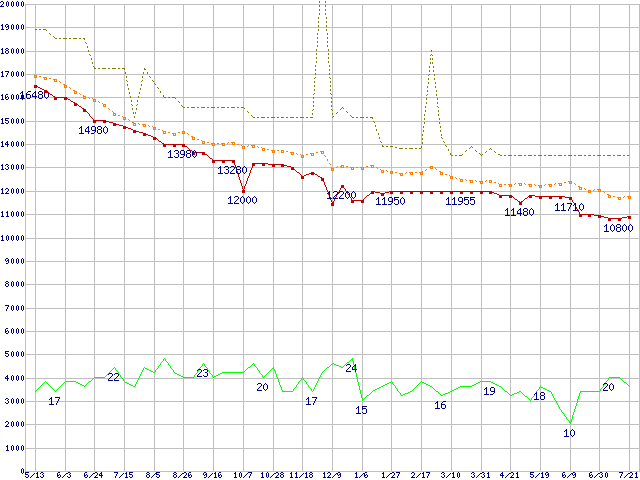 ※このグラフは過去のデータも税率5%相当に調整した税込み相当額のグラフです。 税率変更や、総額表示方式導入(2004年4月)の影響は除いています。 | | | ●凡例 | 最安値 (点線部は販売店未確認 または未調査) | 平均値 | 最高値 | ショップ数 |