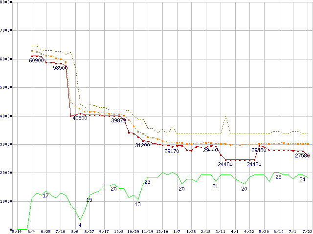 | Athlon 64 3500+(2.2GHz,L2 512KB)の価格推移 | | | (2004年5月14日~2005年7月22日) |
