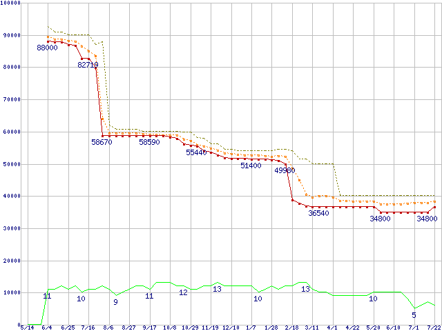 | Athlon 64 3700+(2.4GHz,L2 1MB)の価格推移 | | | (2004年5月14日~2005年7月22日) |