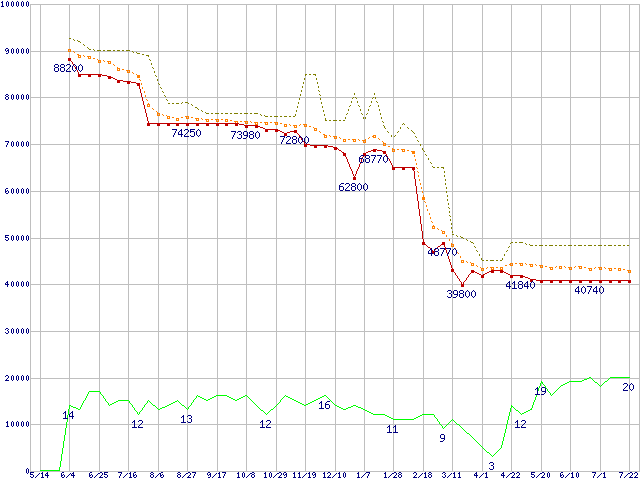 | Athlon 64 3800+(2.4GHz,L2 512KB)の価格推移 | | | (2004年5月14日~2005年7月22日) |