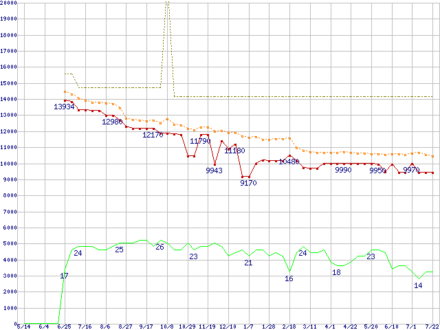 ※このグラフは過去のデータも税率5%相当に調整した税込み相当額のグラフです。 税率変更や、総額表示方式導入(2004年4月)の影響は除いています。 | | | ●凡例 | 最安値 (点線部は販売店未確認 または未調査) | 平均値 | 最高値 | ショップ数 |