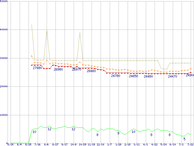 ※このグラフは過去のデータも税率5%相当に調整した税込み相当額のグラフです。 税率変更や、総額表示方式導入(2004年4月)の影響は除いています。 | | | ●凡例 | 最安値 (点線部は販売店未確認 または未調査) | 平均値 | 最高値 | ショップ数 |