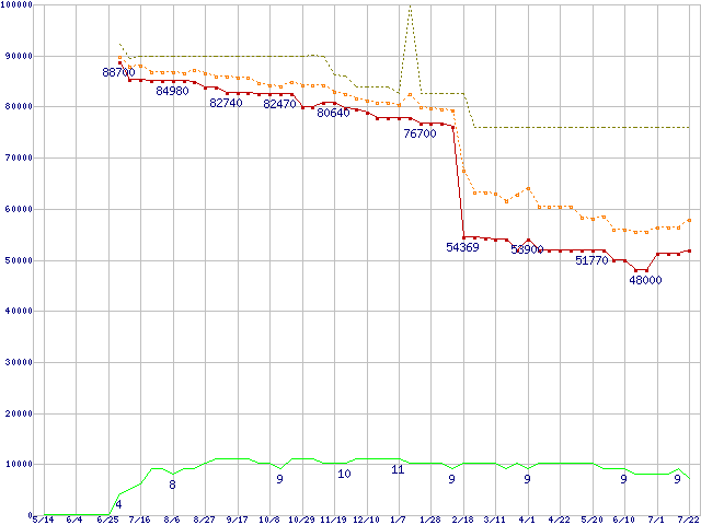※このグラフは過去のデータも税率5%相当に調整した税込み相当額のグラフです。 税率変更や、総額表示方式導入(2004年4月)の影響は除いています。 | | | ●凡例 | 最安値 (点線部は販売店未確認 または未調査) | 平均値 | 最高値 | ショップ数 |