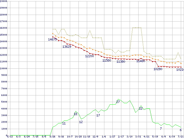 ※このグラフは過去のデータも税率5%相当に調整した税込み相当額のグラフです。 税率変更や、総額表示方式導入(2004年4月)の影響は除いています。 | | | ●凡例 | 最安値 (点線部は販売店未確認 または未調査) | 平均値 | 最高値 | ショップ数 |