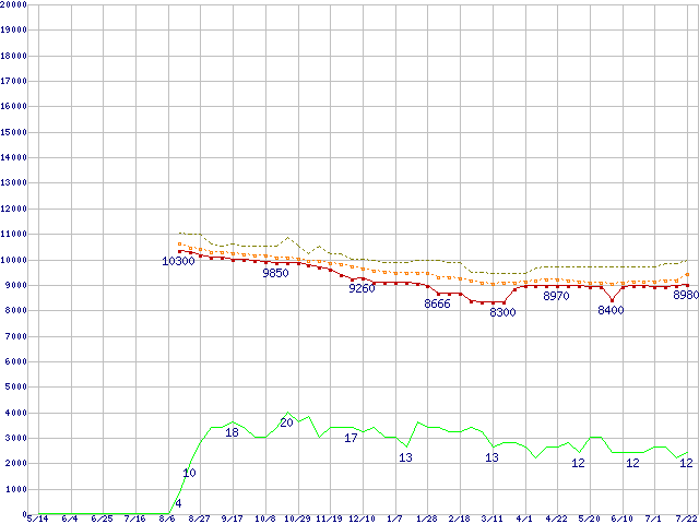 ※このグラフは過去のデータも税率5%相当に調整した税込み相当額のグラフです。 税率変更や、総額表示方式導入(2004年4月)の影響は除いています。 | | | ●凡例 | 最安値 (点線部は販売店未確認 または未調査) | 平均値 | 最高値 | ショップ数 |