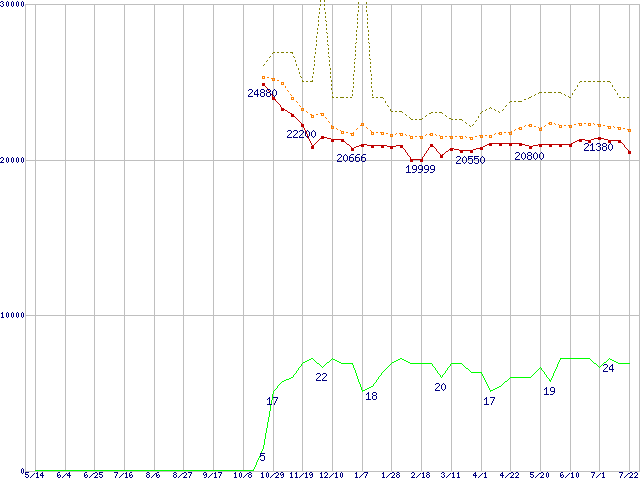 ※このグラフは過去のデータも税率5%相当に調整した税込み相当額のグラフです。 税率変更や、総額表示方式導入(2004年4月)の影響は除いています。 | | | ●凡例 | 最安値 (点線部は販売店未確認 または未調査) | 平均値 | 最高値 | ショップ数 |
