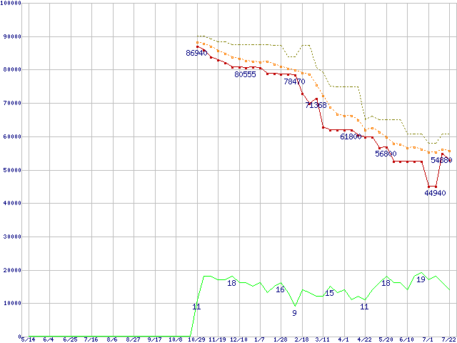 ※このグラフは過去のデータも税率5%相当に調整した税込み相当額のグラフです。 税率変更や、総額表示方式導入(2004年4月)の影響は除いています。 | | | ●凡例 | 最安値 (点線部は販売店未確認 または未調査) | 平均値 | 最高値 | ショップ数 |