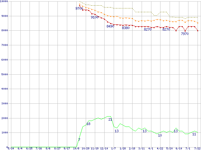 ※このグラフは過去のデータも税率5%相当に調整した税込み相当額のグラフです。 税率変更や、総額表示方式導入(2004年4月)の影響は除いています。 | | | ●凡例 | 最安値 (点線部は販売店未確認 または未調査) | 平均値 | 最高値 | ショップ数 |