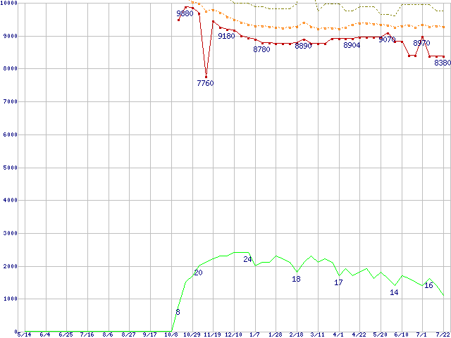 ※このグラフは過去のデータも税率5%相当に調整した税込み相当額のグラフです。 税率変更や、総額表示方式導入(2004年4月)の影響は除いています。 | | | ●凡例 | 最安値 (点線部は販売店未確認 または未調査) | 平均値 | 最高値 | ショップ数 |