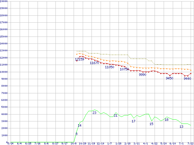 ※このグラフは過去のデータも税率5%相当に調整した税込み相当額のグラフです。 税率変更や、総額表示方式導入(2004年4月)の影響は除いています。 | | | ●凡例 | 最安値 (点線部は販売店未確認 または未調査) | 平均値 | 最高値 | ショップ数 |