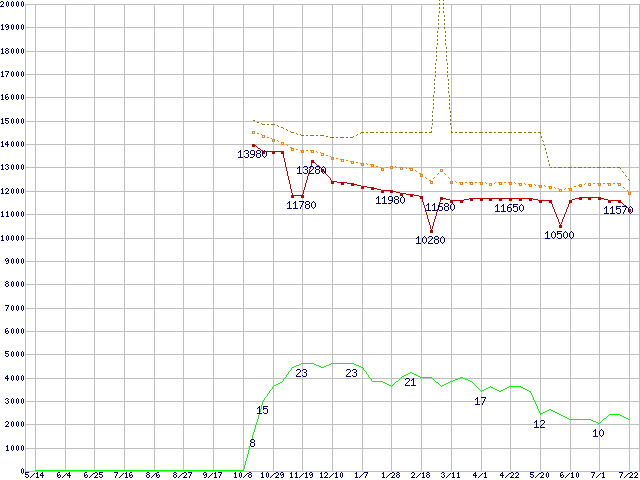 ※このグラフは過去のデータも税率5%相当に調整した税込み相当額のグラフです。 税率変更や、総額表示方式導入(2004年4月)の影響は除いています。 | | | ●凡例 | 最安値 (点線部は販売店未確認 または未調査) | 平均値 | 最高値 | ショップ数 |