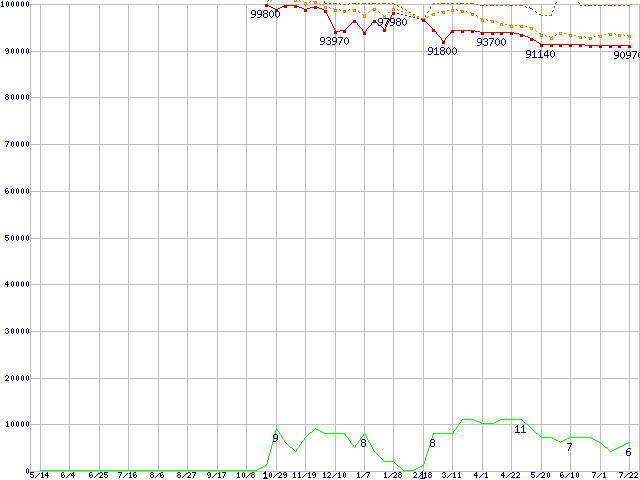 ※このグラフは過去のデータも税率5%相当に調整した税込み相当額のグラフです。 税率変更や、総額表示方式導入(2004年4月)の影響は除いています。 | | | ●凡例 | 最安値 (点線部は販売店未確認 または未調査) | 平均値 | 最高値 | ショップ数 |