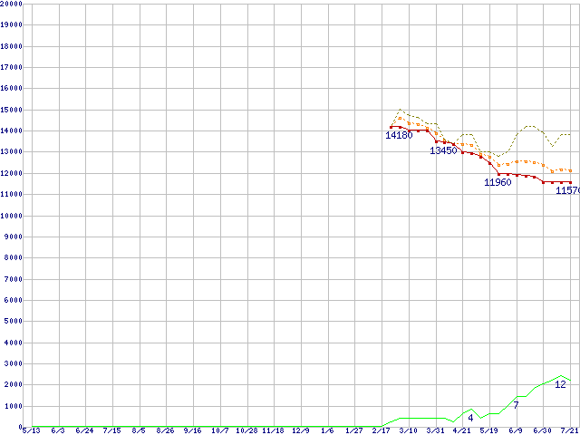 ※このグラフは過去のデータも税率5%相当に調整した税込み相当額のグラフです。 税率変更や、総額表示方式導入(2004年4月)の影響は除いています。 | | | ●凡例 | 最安値 (点線部は販売店未確認 または未調査) | 平均値 | 最高値 | ショップ数 |