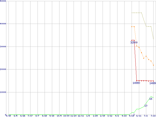 ※このグラフは過去のデータも税率5%相当に調整した税込み相当額のグラフです。 税率変更や、総額表示方式導入(2004年4月)の影響は除いています。 | | | ●凡例 | 最安値 (点線部は販売店未確認 または未調査) | 平均値 | 最高値 | ショップ数 |