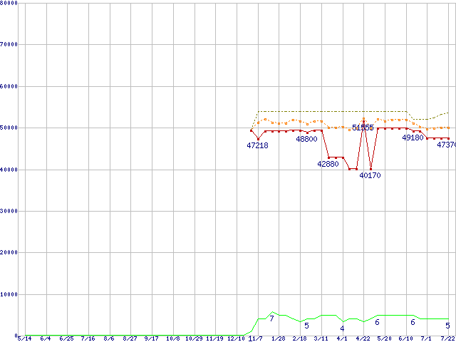 ※このグラフは過去のデータも税率5%相当に調整した税込み相当額のグラフです。 税率変更や、総額表示方式導入(2004年4月)の影響は除いています。 | | | ●凡例 | 最安値 (点線部は販売店未確認 または未調査) | 平均値 | 最高値 | ショップ数 |