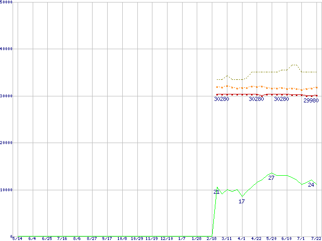 ※このグラフは過去のデータも税率5%相当に調整した税込み相当額のグラフです。 税率変更や、総額表示方式導入(2004年4月)の影響は除いています。 | | | ●凡例 | 最安値 (点線部は販売店未確認 または未調査) | 平均値 | 最高値 | ショップ数 |