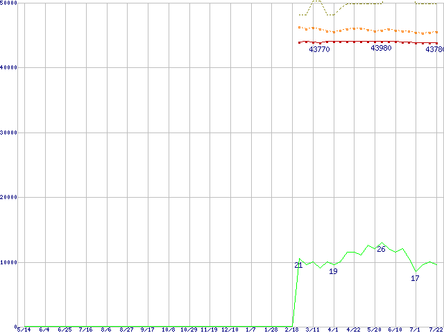 ※このグラフは過去のデータも税率5%相当に調整した税込み相当額のグラフです。 税率変更や、総額表示方式導入(2004年4月)の影響は除いています。 | | | ●凡例 | 最安値 (点線部は販売店未確認 または未調査) | 平均値 | 最高値 | ショップ数 |