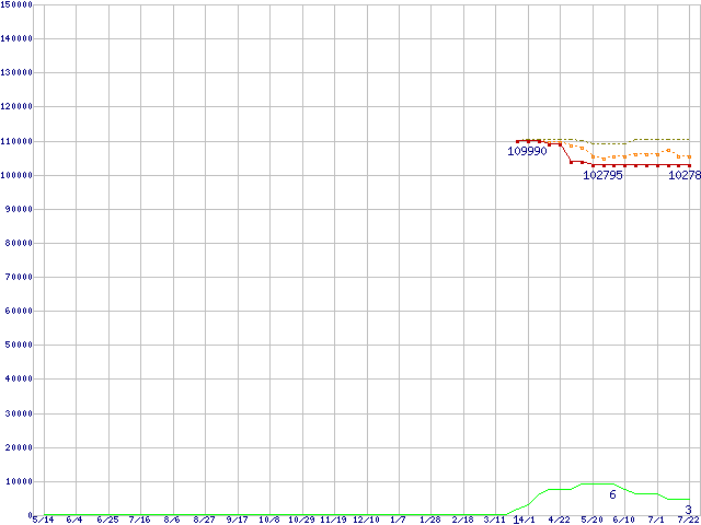 ※このグラフは過去のデータも税率5%相当に調整した税込み相当額のグラフです。 税率変更や、総額表示方式導入(2004年4月)の影響は除いています。 | | | ●凡例 | 最安値 (点線部は販売店未確認 または未調査) | 平均値 | 最高値 | ショップ数 |